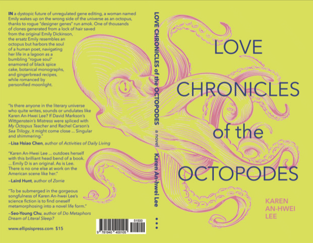 Karen An-Hwei Lee, whose marvelous mind gave us Kafka — weird as ever and wonderfully alive — in twenty-first century Los Angeles and then a post-apocalyptic data cloud on a quest for the keys to happiness, outdoes herself with this brilliant head bend of a book. Love Chronicles of the Octopodes chronicles the adventures of one Emily D, octopus extraordinaire whose signal genetic material can be traced back to a certain legendary poet from Amherst but whose verve and swerve are all her own. Which is to say that Emily D is an original. As is Lee. There is no one else at work on the American scene like her.” —Laird Hunt, author of Zorrie